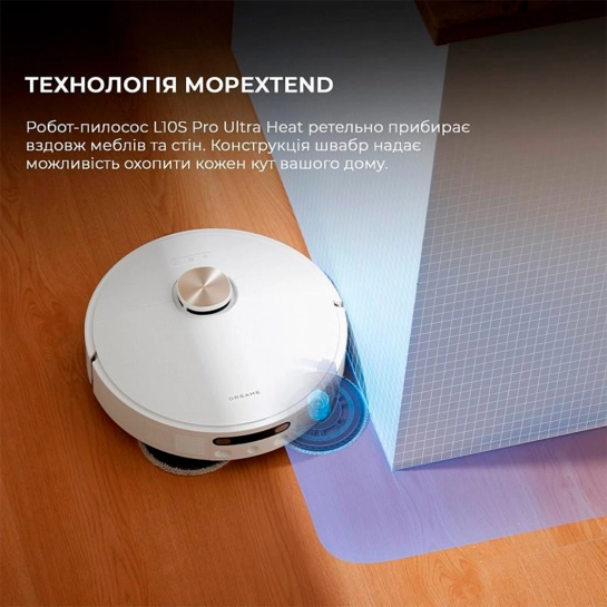 Відмінною особливістю робота-прибирача L10s Pro Ultra є надзвичайно ефективна робота. Він використовує сучасну систему MopExtend™ для точного збирання важкодоступних місць. Як? Робот автоматично розпізнає кути та краї, що дозволяє йому розширити зону дії швабри. Це дозволяє L10s Pro Ultra мити підлогу вздовж плінтусів та інших країв. Він також добирається до будь-якого вузького і тісного простору, легко видаляючи дрібний пил, крихти від їжі і розлиту рідину. Тепер кожен куточок вашого будинку буде сяяти чистотою!
