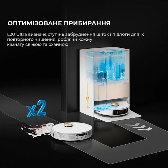 Просто довіртеся L20 Ultra Complete. Робот візьме на себе не лише прибирання будинку, а й очищення швабр. У ході сеансу він періодично заїжджає на базу та промиває подушечки. Але робить це не так, як усі замість холодної води використовує гарячу (59 градусів). Завдяки цьому швабри завжди чисті, а бруд не розтирається по підлозі. Після того, як підлога буде вимитий, робот ще раз ретельно промиє насадки.