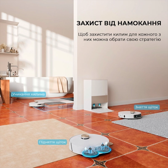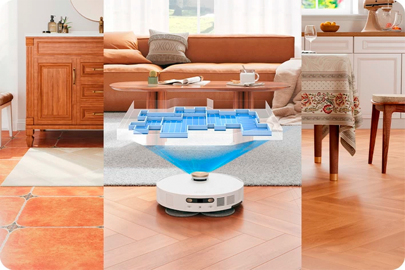 Коли L20 Ultra Complete вперше знайомиться із будинком, він будує 3D-карту кожного поверху. А в програмі Dreamehome ви завжди можете змінити її, встановивши віртуальні стіни або заборонені зони. Можна вибрати план прибирання кожної кімнати та запланувати графік очищення. Є й функція лінійного прибирання – коли робот очищає підлогу та прокладає маршрут без повторів. За сухе очищення відповідає рекордна потужність 7000 Па та оновлений щітковий валик. Прогумовані V-подібні вставки на щітці забезпечують щільний контакт із поверхнею для легкого збирання сміття без сплутування. Робот-пилосос також використовує ультразвукову технологію для розпізнавання килимів. Він автоматично посилює потужність і піднімає подушечки, щоб залишити ваш килим сухим та чистим. Висота підняття швабра збільшилася - до 10,5 мм. А на випадок дуже високого ворсу робота має іншу стратегію. Спочатку він миє підлогу навколо килима, потім заїжджає на станцію, сам знімає швабри і повертається, щоб пропилососити килим.