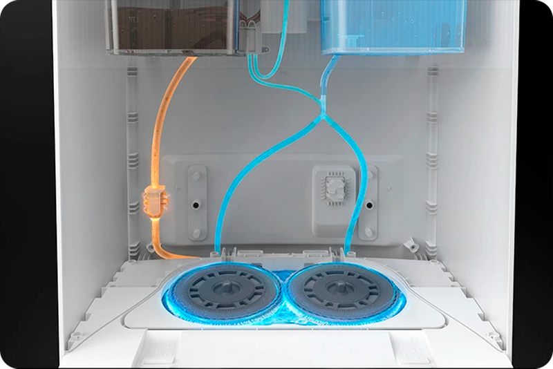 З L20 Ultra Complete ви можете забути про збирання на кілька місяців. Пилозбірник розрахований на 3,2 літри і його вистачає на 75 днів. Після цього просто замініть пиловий мішок на новий. Решта станція самоочищення зробить за вас. Вона промиє насадки нагрітою водою та просушить їх гарячим повітрям. Тут робот видує зібране сміття через систему DualBoos 2.0, а також поповнить запаси води для вологого збирання. Вода подається із вбудованого резервуару на 4,5 літри, а одного наповнення достатньо для прибирання площі до 985 кв. Щоб зробити підлогу чистою та свіжою, ви можете додати миючий засіб в окремий відсік станції. При бажанні ви можете придбати комплект трубок і підключити станцію до водопроводу - це автоматизує подачу чистої води і скидання брудної.