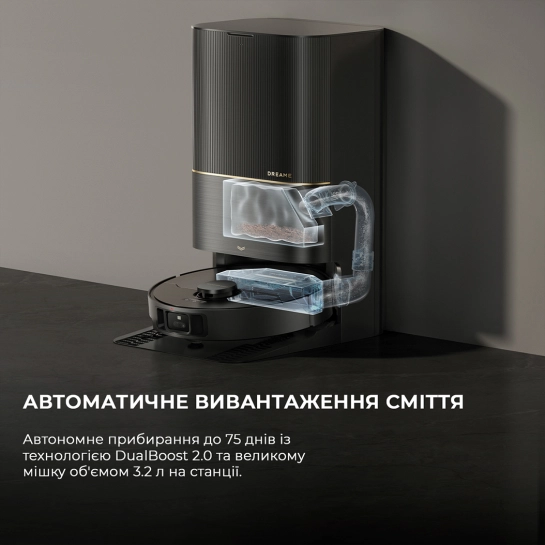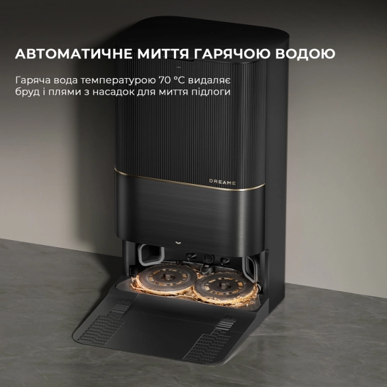 Насолоджуйтесь повністю автоматизованим доглядом та прибиранням протягом 2,5 місяця. Після завершення сеансу робот Dreame повертається на станцію, щоб промити насадки гарячою водою та ретельно їх просушити. Якщо вибрати вологе прибирання з миючим розчином, він автоматично дозується з відповідного відсіку станції.