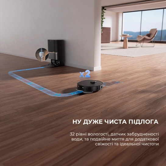 32 режими дозволяють гнучко керувати зволоженням. Вибирайте ідеальний сценарій миття для кожної кімнати залежно від типу покриття та забруднень. Робот не залишає після себе розлучень і плям, оскільки датчики аналізують забрудненість відпрацьованої води, а насадки промиваються від залишкового бруду.
