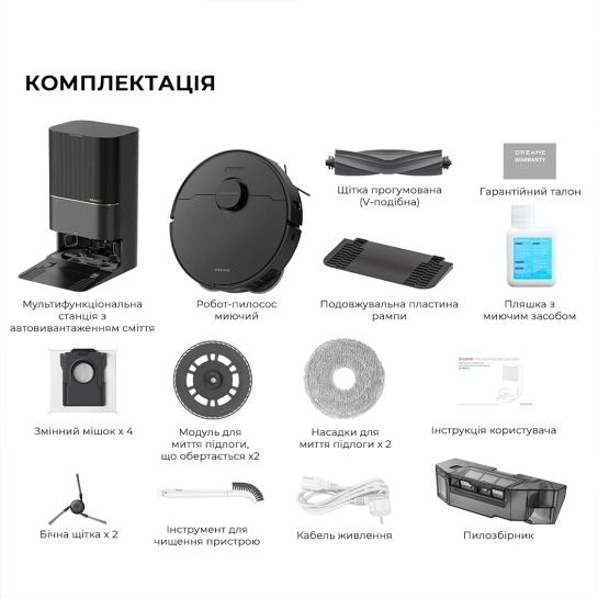Dreame X40 Ultra Complete White поставляється з док-станцією з функцією самообслуговування та розширеним набором аксесуарів.