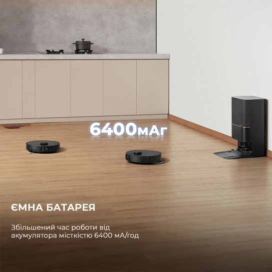 Dreame працює від батареї на 6400 мАг, а одного заряду вистачає до 260 хвилин. Середній час автономності в комбінованому режимі – 194 хвилини. Завдяки площі покриття 137 кв. метрів робот легко прибирає одноповерховий будинок. Він сам повертається на док-станцію, коли потребує підзарядки, очищення насадок або дозаправки води, після чого продовжує очищення.