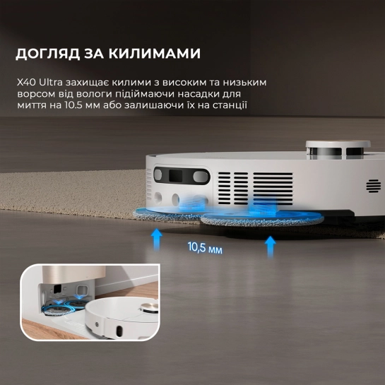 Щоб не забруднити килим, пилосос самостійно піднімає насадки-швабри на висоту 1.05 см. Крім того, ви можете вибрати сценарій, за якого помічник скидає швабри на станції, перш ніж заїхати на килим. Також у додатку є режим посиленого всмоктування для ретельного збирання ворсу.