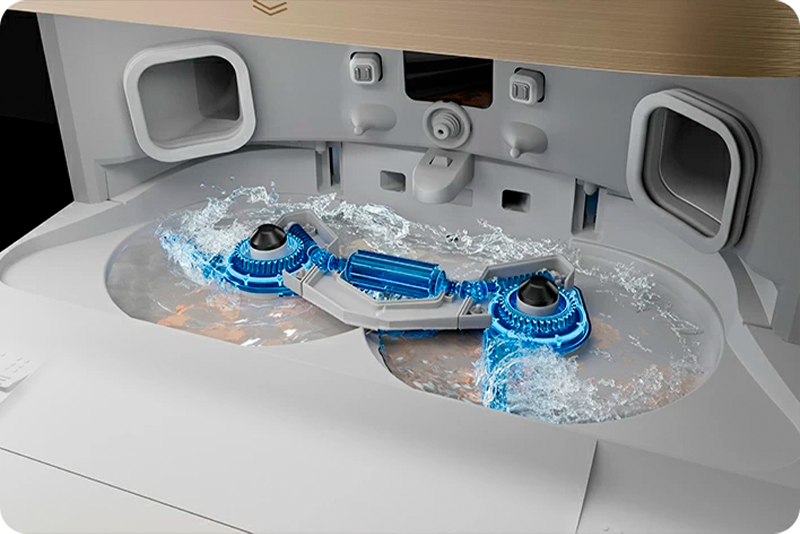 Синхронний рух миючих насадок і щітки, що підмітає, робить прибирання точним і ефективним. Бічна щітка здійснює вертикальний рух з амплітудою 1 см, повторюючи траєкторію основної щітки та миючих насадок. Завдяки цьому килими завжди залишаються чистими.