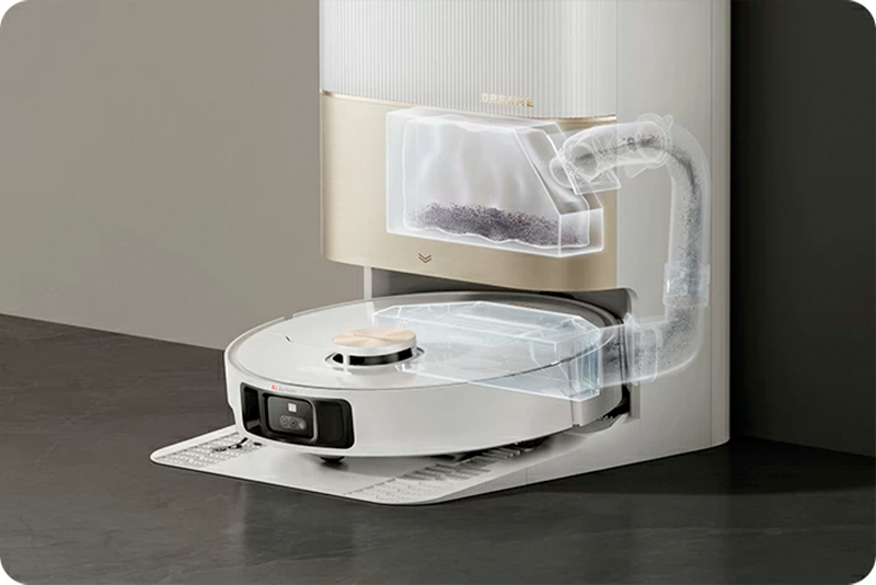 Насолоджуйтесь повністю автоматизованим доглядом та прибиранням протягом 2,5 місяця. Після завершення сеансу робот Dreame повертається на станцію, щоб промити насадки гарячою водою та ретельно їх просушити. Якщо вибрати вологе прибирання з миючим розчином, він автоматично дозується з відповідного відсіку станції.