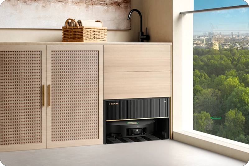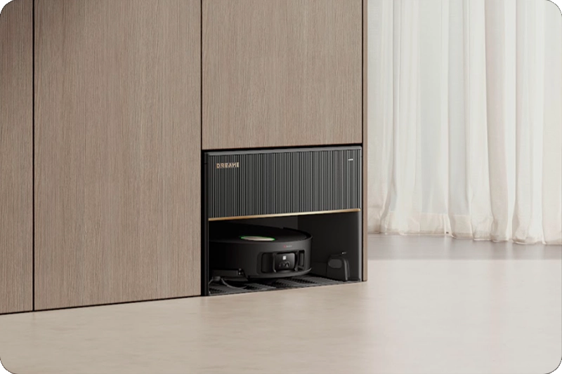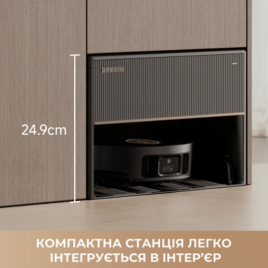 Інтелектуальна станція Dreame X50 має висоту всього 24,9 см, тому легко вміщується навіть під тумбою або поряд зі стіною. Незважаючи на компактні розміри, вона поєднує все важливе: автоматичне очищення мікрофібри, сушіння гарячим повітрям, дозаправлення водою та заряджання. Зручність та автоматизований догляд за будинком – ось на що націлений дизайн Dreame.