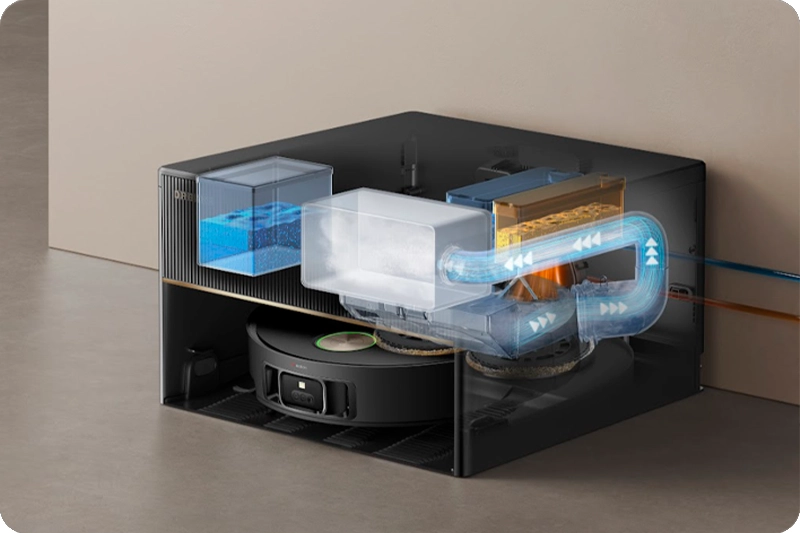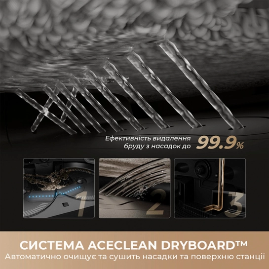 Завдяки технології AceClean DryBoard миючі насадки та очисна платформа зберігаються в чистоті без участі людини. Спочатку система ретельно промиває мопи чистою водою, видаляючи бруд та залишки миючих засобів. Після промивання система автоматично висушує їх, запобігаючи накопиченню вологи. Сушіння відбувається теплим повітрям, яке рівномірно розподіляється як по самих насадках, так і по платформі, запобігаючи утворенню вологи, цвілі або появі неприємного запаху. Вам не потрібно нічого знімати чи промивати вручну.