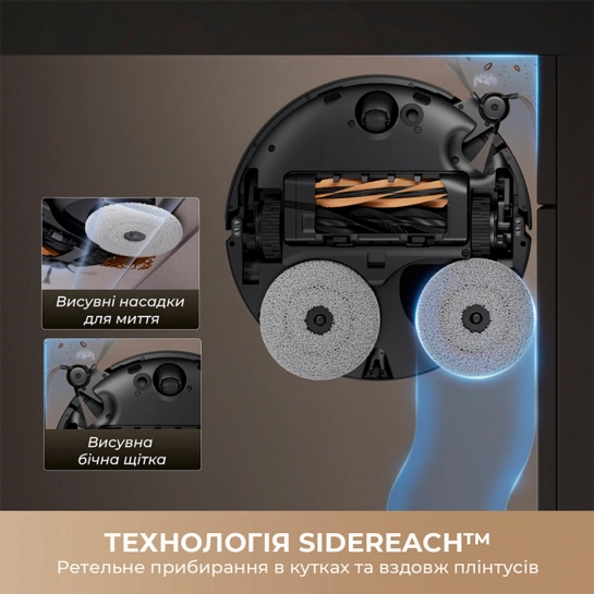 Завдяки інноваційній технології MopExtend Robo Swing, X50 Master здатний дістатися до важкодоступних місць та простору під меблями. Dreame автоматично висуває один з мопів убік, щоб дістатися місць, які зазвичай залишаються неохопленими - уздовж плінтусів, у глибоких кутах або біля ніжок. Моп подається в бік під час руху, повторюючи рух, що коливається, що допомагає підмітати якісніше. Технологія SideReach ефективно справляється з очищенням навіть у найвужчих місцях, наприклад, між ніжками стільців або поруч із тумбами.