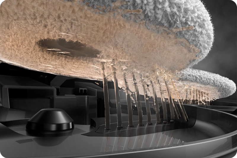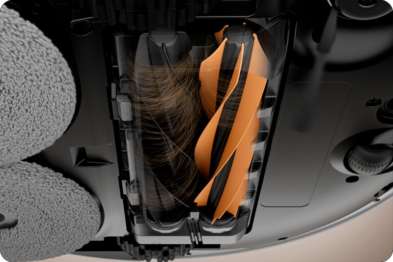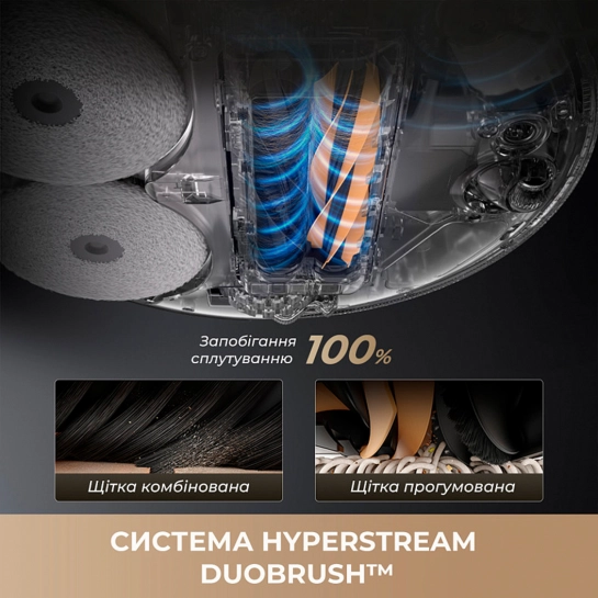 Завдяки поєднанню двох щіток – м'якої зі щетиною та TPU, а також суцільною силіконовою – система HyperStream DuoBrush ефективно піднімає та спрямовує волосся у всмоктувальний канал, не даючи йому намотуватися. Додатковий бічний повітряний потік допомагає вчасно втягувати довге волосся (до 30 см), тому щітки залишаються чистими, а прибирання – стабільно потужним. X50 Master забезпечує глибоке очищення будь-яких типів покриттів із мінімальним рівнем шуму.