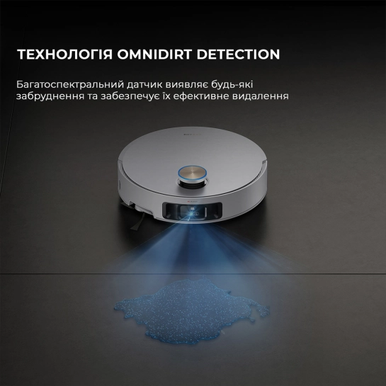 Визначайте та розділяйте всі різновиди плям та бруду за допомогою OmniDirt Detection, що моментально адаптує процес прибирання під будь-яке забруднення. Багатоспектральний датчик виявляє стійкі та спрямовує пилосос на огляд ділянок для бездоганної чистоти. Крім того, пилосос визначає і повторно видаляє водяні плями, що залишилися.
