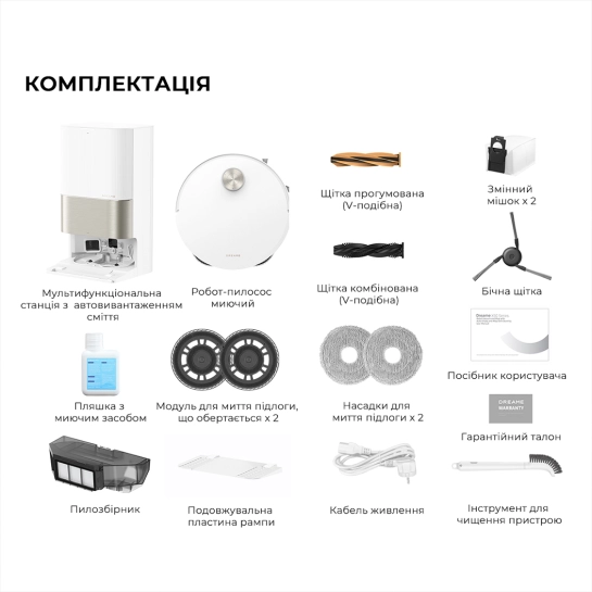 Бічна щітка, Пляшка з миючим засобом, Модуль для миття підлоги х 2, Гарантійний талон, Інструмент для чищення пристрою, Кабель живлення, Мультифункціональна станція з автовивантаженням сміття, Насадки для миття підлоги х 2, Пилозбірник, Робот-пилосос миючий, Посібник користувача рампи, Щітка комбінована (V-подібна), Щітка прогумована (V-подібна)