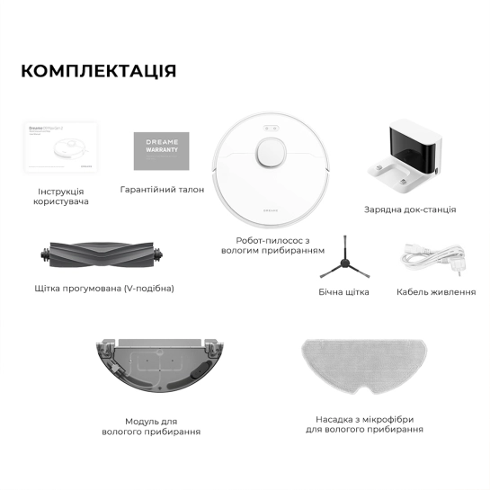 Купуючи робот-пилосос Dreame D9 MAX Gen 2, ви отримуєте все необхідне для ефективного прибирання вашого приміщення. До складу комплекту включено: