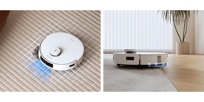 При заїзді на килим робот автоматично піднімає диски, що чистять вгору на 9 мм, щоб вода не потрапила на ворс. Потужність всмоктування навпаки збільшується до максимуму, що дозволяє ретельно зібрати сміття. А коли робот повертається на тверду підлогу, швабра знову опускається.
