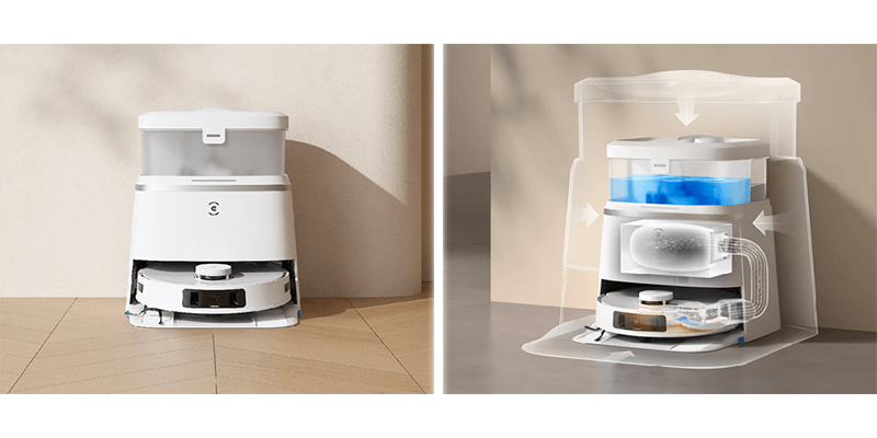 Робот пилососу Ecovacs Deebot Ozmo T30 Pro OMNI комплектується багатофункціональною станцією самоочищення, яка автоматизує процес збирання. На базі прибиральник самостійно позбавляється зібраного сміття, промиває насадки, що чистять, гарячою водою в процесі роботи і після закінчення циклу очищення, а також висушує швабру гарячим повітрям і доливає воду в бак.