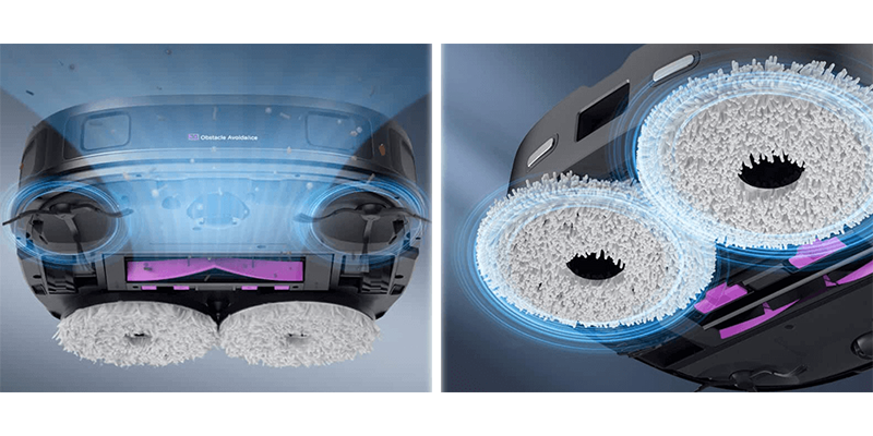 Робот полотер для вологого прибирання використовує два чистячі колеса, на які надягають насадки з м'якої ворсистої тканини. Колеса обертаються зі швидкістю 200 об/хв і щільно притискаються до поверхні, що дозволяє ретельно відмивати застарілі забруднення та липкі плями.