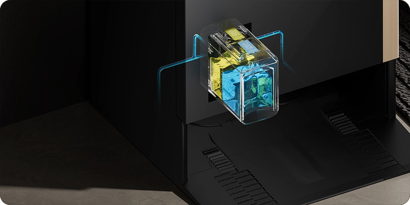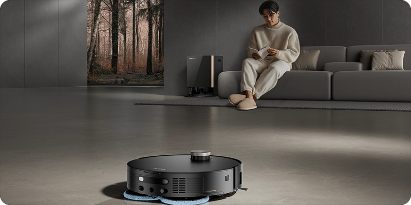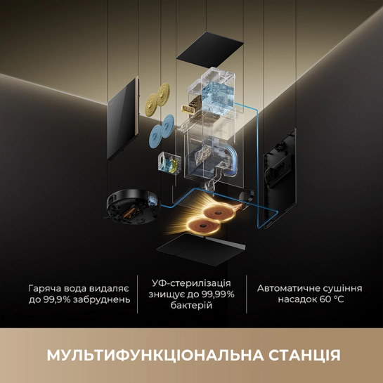 Серце системи – док-станція, яка робить все за вас. Вона миє швабру і робить це окропом за температури 100°C. Ця стратегія знищує 99,9% бактерій та неприємних запахів, що виникають у вологих насадках. Після миття активується система сушіння PTC гарячим повітрям, що запобігає появі плісняви. Додатково вбудоване ультрафіолетове випромінювання стерилізує поверхню швабри, наближаючи систему до медичного рівня чистоти. Станція також автоматично наповнює бак робота водою та очищає пилозбірник, висушуючи його зсередини. Вам залишається лише раз на кілька тижнів замінити мішок для пилу і долити чисту воду — решта системи бере на себе.