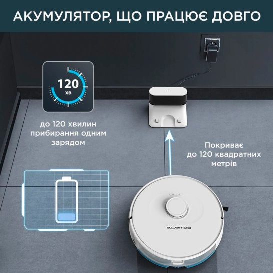 Довговічна зарядка батареї забезпечує 120 хвилин продуктивного прибирання, щоб охопити до 120 квадратних метрів простору - цього достатньо, щоб забрати весь будинок на одній зарядці.
