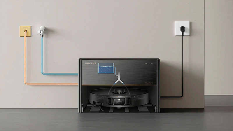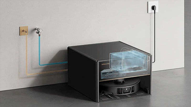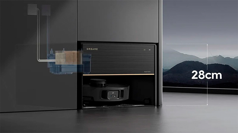 На відміну від більшості роботів з базами самообслуговування, Dreame Master має дуже компактні розміри і висота бази не перевищує 28 см. Таке рішення вдалося реалізувати завдяки системі підключення бази до водопроводу та зливу в каналізацію. База практично не зберігає в собі відпрацьовану воду (їй не потрібне місце для великого бака брудної води) та для чистої води досить невеликого бака. По суті, у верхньому відсіку бази залишився тільки мішок для скидання сухого сміття з об'ємом 4.2 літра. Звідси і вийшли такі скромні габарити.