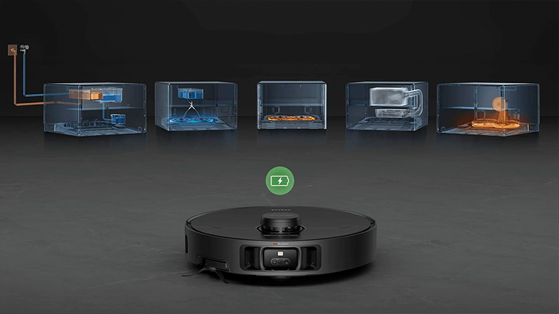 Після кожного прибирання база здійснює очищення сміттєвого бака в роботі. Забирає зібране сміття та продує фільтр. Автономність роботи може досягати 90 днів, після цього необхідно замінити мішок у базі на новий.