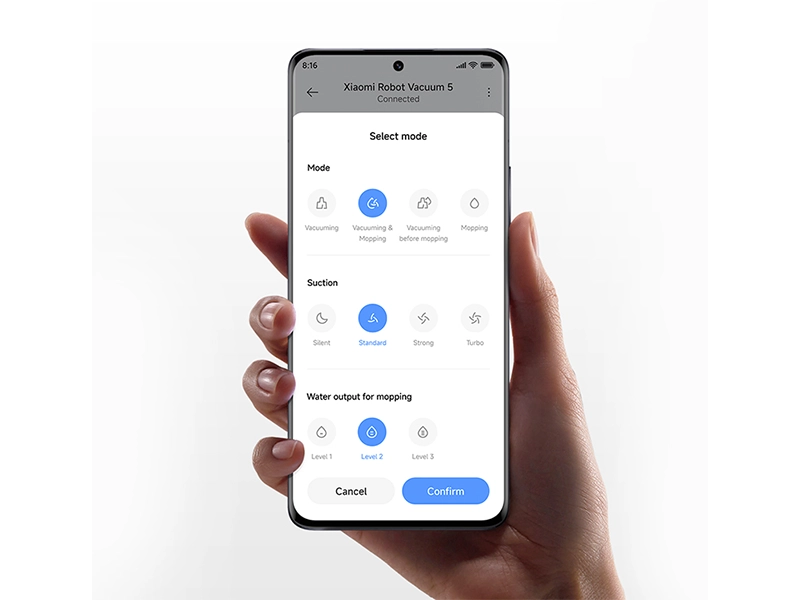 З додатком Xiaomi Home ти зможеш керувати прибиранням, навіть перебуваючи поза домом. Програма дозволяє запускати прибирання одним дотиком. Плануй роботу пилососа та швабри віддалено, налаштовуй сценарії за розкладом, створюй заборонені зони та синхронізуй роботу розумних пристроїв, підлаштовуючи їх під свій розклад. Наприклад, робот може починати прибирання щодня о 8:00, а очищувач повітря включатися відразу після завершення прибирання. Голосове управління розширює твої можливості управління та контролю.