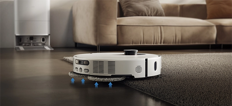 Xiaomi Robot Vacuum 5 знає, як поводитися з килимами. Завдяки ультразвуковому датчику підлоги він точно визначає покриття та автоматично піднімає швабру на 15 мм, щоб уникнути намокання килимів та килимових покриттів. Ти можеш не переживати за чистоту та збереження килимів – пристрій автоматично вибирає оптимальний режим збирання, забезпечуючи оптимальний результат без намокання.