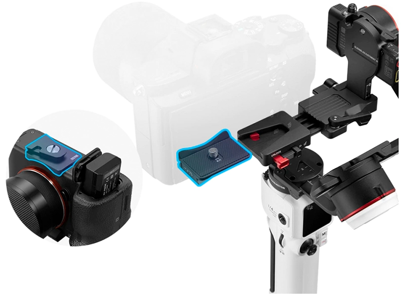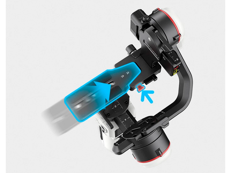 Винахідливі замки та клямки для зберігання. Гімбал можна настроїти на режим половинного зберігання/повного зберігання. При перемиканні в режим половинного зберігання зі встановленою камерою не потрібне регулювання плеча осі, а при розширенні не потрібне повторне балансування.