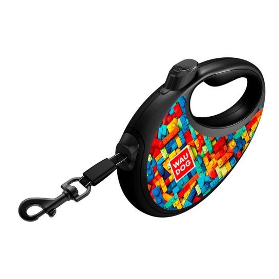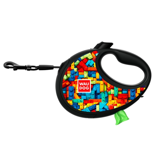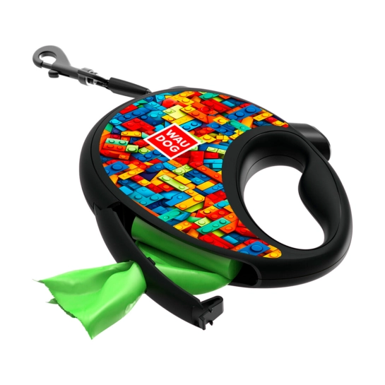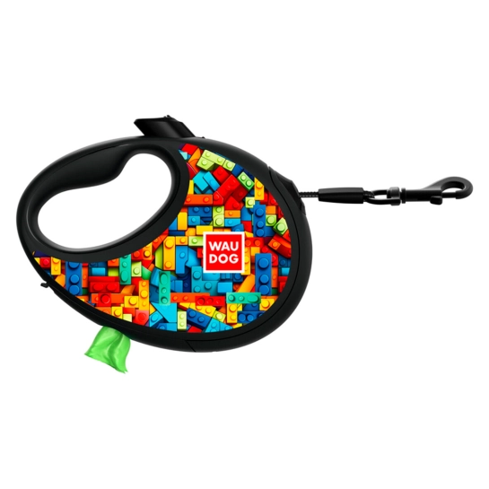 Рулетка-повідець для собак WAUDOG R-leash з контейнером для пакетів, малюнок Блоки, світловідбивна стрічка, L, до 40 кг, 5 м (257-4056)