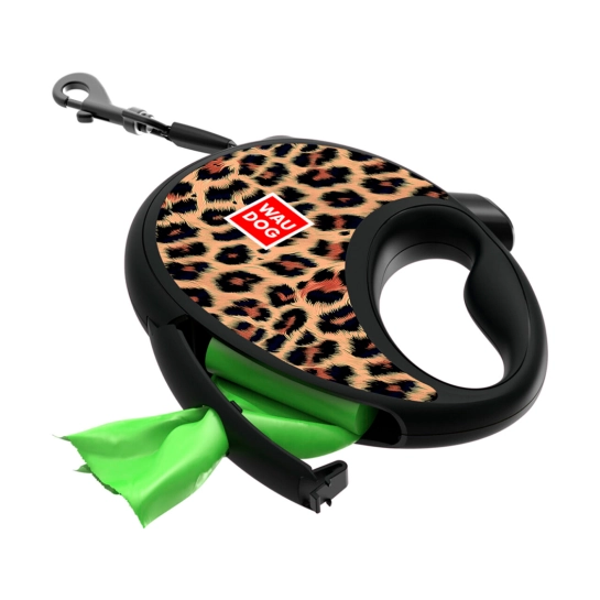 Опис Рулетка-повідець для собак WAUDOG R-leash з контейнером для пакетів, малюнок Леопард, світловідбивна стрічка, M, до 20 кг, 5 м (256-4066)