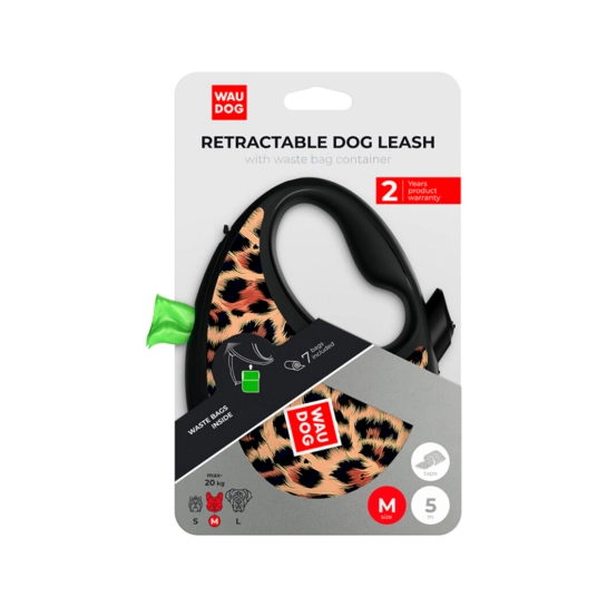 Рулетка-повідець для собак WAUDOG R-leash з контейнером для пакетів, малюнок Леопард, світловідбивна стрічка, M, до 20 кг, 5 м (256-4066)
