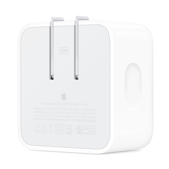 Компактний адаптер живлення з двома портами USB-C потужністю 35 Вт дозволяє заряджати два пристрої одночасно вдома, в офісі або в дорозі. Компактний розмір і складні штирі полегшують упаковку і зберігання. Apple рекомендує використовувати його з MacBook Air. Ви також можете використовувати його з iPhone, iPad, Apple Watch та AirPods.