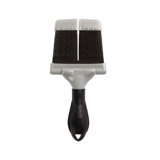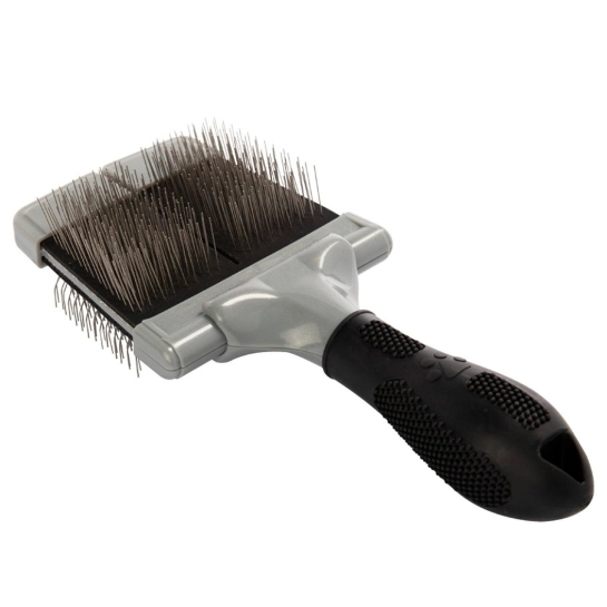 Щітка розроблена спеціально для собак і кішок з кучерявою, середньою та довгою вовною. Двостороння щітка-пуходерка не травмує шкіру, незважаючи на те, що щетина двох видів зроблена з нержавіючої сталі: вигнуті щетинки допомагають видалити ковтуни та сплутану вовну, не пошкоджуючи її, а прямі щетинки – зробити шерсть гладкою та блискучою. Двостороння конструкція з гнучкою насадкою повторює природні контури голови і тіла вихованця, що не тільки полегшує грумінг, але також приносить задоволення вашому улюбленцю. Ергономічна ручка гарантує зручне та безпечне використання.