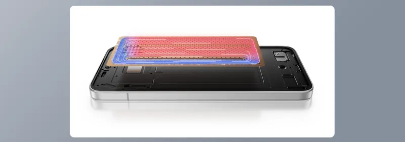 Завдяки 13 датчикам та самостійно розробленому алгоритму управління температурою на базі AI досягається точне сприйняття температури телефону та навколишнього середовища.