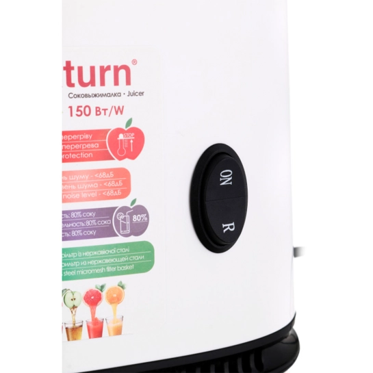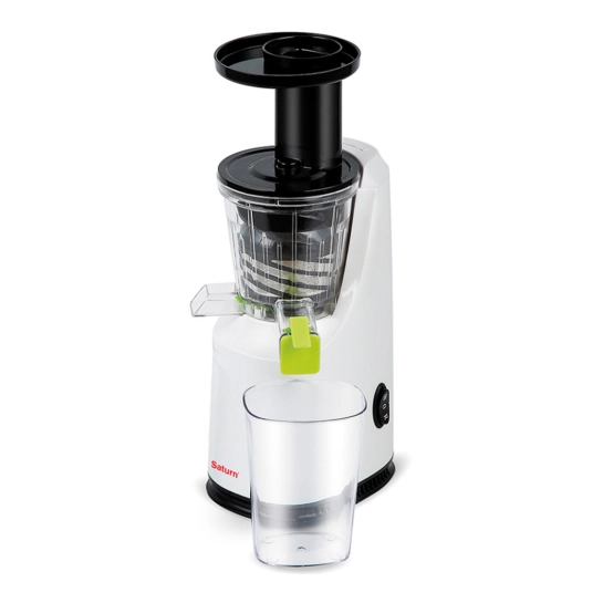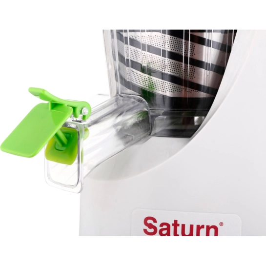Шнековий соковитискач Saturn ST-FP7046, з насадками для ягід, томатів та фруктів. З функцією автоматичного викиду м'якоті. Соковитискач на одну швидкість із резервуаром на 700 мл. Доповнена ковзними гумовими ніжками.