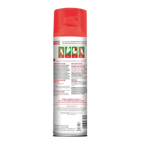 Знищувач плям і запахів з посиленою формулою для кішок у формі аерозоль-піни від Nature's Miracle розроблений для видалення забруднень, що важко виводяться, на килимах, пледах, меблів, тканинах та інших поверхнях. Засіб усуває всі органічні плями і запахи, у тому числі від фекалій, блювання, сечі, жиру, бруду і т. п. Піна проникає глибоко у ворс поверхні, щоб ефективно видалити навіть плями, що в'їлися, і запахи.