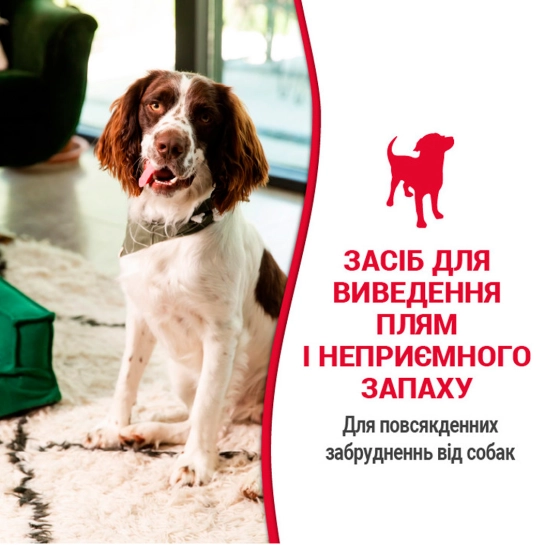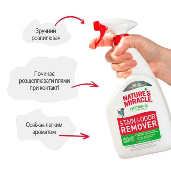 Універсальний знищувач плям та запахів для собак Nature's Miracle – ідеальне рішення для будь-яких забруднень, залишених тваринами. Плями та запахи від трави, бруду, блювання, сечі, фекалій та крові – не проблема для біоензимної формули Nature's Miracle. Універсальний знищувач плям та запахів ефективно усуває всі органічні плями та запахи, залишаючи легкий аромат чистоти. Засіб можна використовувати на килимах, твердих поверхнях, тканинах, перенесення та спальних місцях тварин. Оновлена формула ще ефективніше справляється навіть із запахами, що в'їлися.