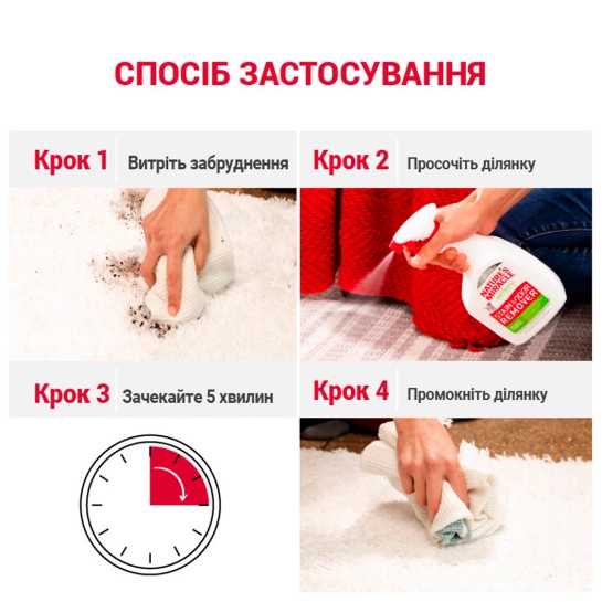 - Завжди застосовуйте засіб першим — засоби для виведення плям інших виробників можуть хімічно закріпити пляму, і її буде неможливо видалити.
