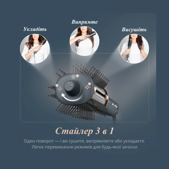 Розкішна зовнішність — це так легко! Відкрийте для себе абсолютно новий спосіб укладки волосся з Air Brush 3D від Rowenta. Стайлер 3-в-1 створює образи під будь-який настрій. Що б ви не задумали — бездоганне вирівнювання або розкішний об’єм — з Air Brush 3D це робити легко, одним поворотом ручки. Стайлер має 3 швидкості та 3 температурні режими для індивідуального підходу до вашої зачіски, а його іонна технологія надаватиме волосю волшебного блиску та шовковистості. Насолоджуйтеся професійною укладкою під будь-який настрій. Обирайте гладке випрямлення або розкішний додатковий об’єм.
