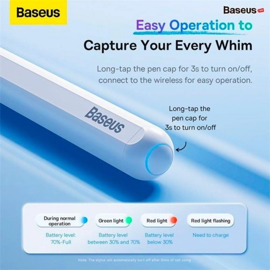 Стилус Baseus Smooth Writing 2 - це сучасне активне перо, розроблене для зручної взаємодії з планшетами iPad, що підтримують Apple Pencil. Його корпус завдовжки 16,5 см виготовлений із міцного алюмінієвого сплаву, що надає пристрою як міцності, так і елегантного зовнішнього вигляду. Модель обладнана світлодіодним індикатором і заряджається через роз'єм USB Type-C. Також передбачена підтримка бездротової зарядки за технологією Qi. Час автономної роботи становить до 10 годин, а повна підзарядка займає всього годину — відмінне рішення для тих, хто цінує мобільність і ефективність.