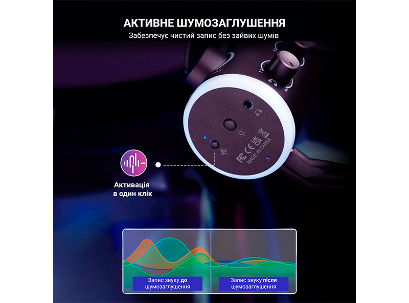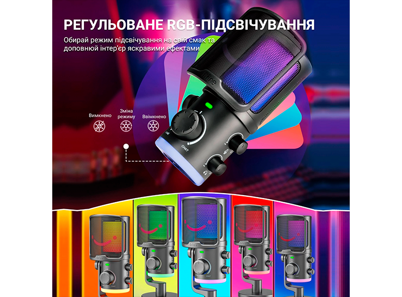Кнопка гучності навушників дозволяє легко регулювати рівень звуку під час моніторингу запису в реальному часі. Копка зміни режимів RGB підсвічування забезпечує його легке регулювання відповідно до вашого настрою.