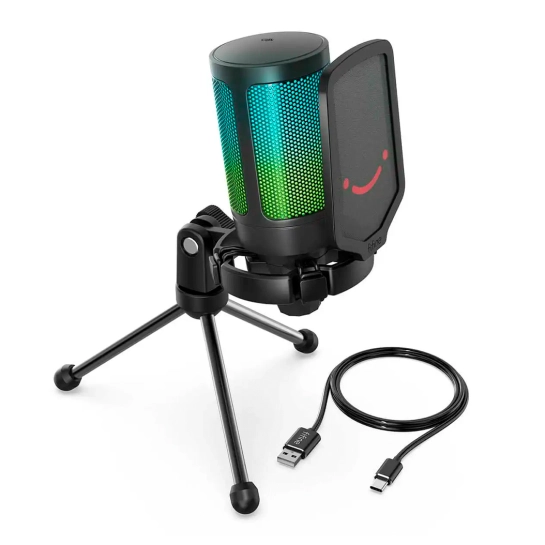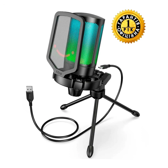 Fifine A6V – якісний ігровий мікрофон із усіма необхідними аксесуарами стане справжнім подарунком для досвідченого геймера. Якісний звук із низькими та глибокими чистими високими частотами; зручна тринога; вражаюче RGB-підсвічування; знімний поп-фільтр. Мікрофон працює на консолях Windows, Mac та PlayStation. USB порт розташований прямо за мікрофоном, що робить підключення зручнішим.