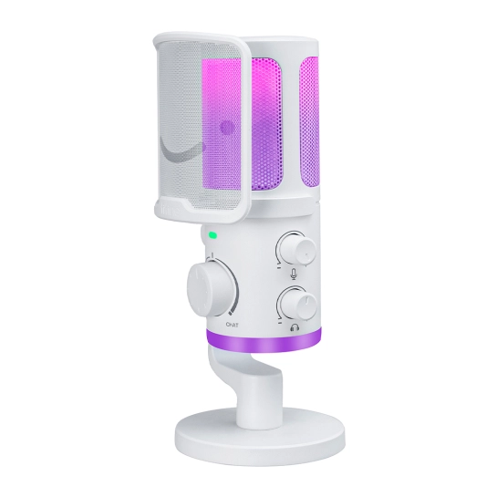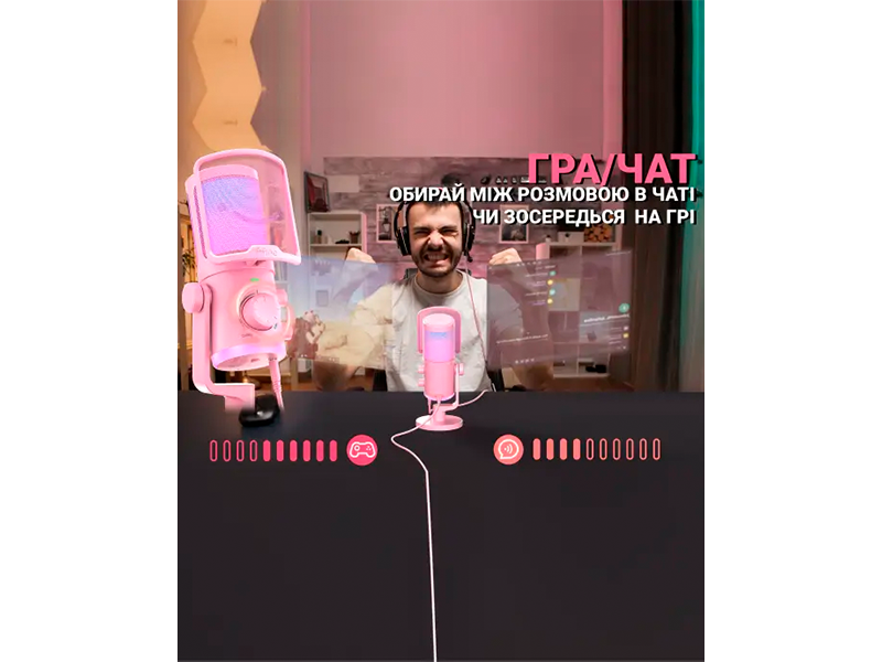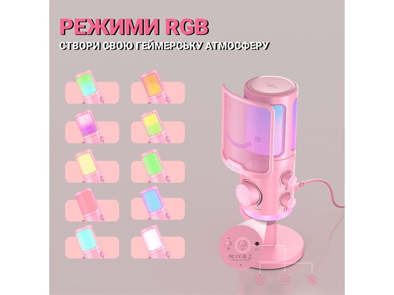 Кнопка гучності навушників дозволяє легко регулювати рівень звуку під час моніторингу запису в реальному часі. Копка зміни режимів RGB підсвічування забезпечує його легке регулювання відповідно до вашого настрою.