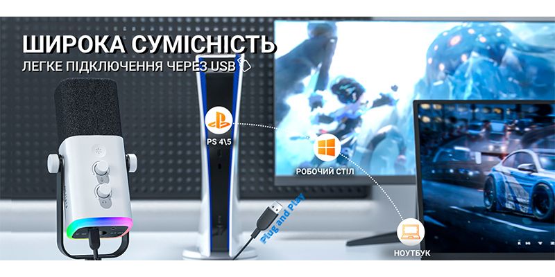 Мікрофон Fifine АМ8P забезпечує універсальність та зручність завдяки двом варіантам підключення через USB Type-C до USB-A (кабель йде в комплекті), або XLR до XLR (кабель можна придбати як окремий аксесуар). Технологія Plug&Play дозволяє відразу почати використовувати мікрофон після підключення без додаткових налаштувань або установок драйверів. Це ідеальне рішення для швидкого та ефективного запису в домашніх умовах, студіях чи трансляціях. Роз'єм XLR дозволяє підключити студійне обладнання до мікрофону, наприклад, звукові карти та мікшери, що дозволяє записувати співи та різні типи музики. Збалансована передача звуку з більшою точністю та кращим захистом від перешкод.