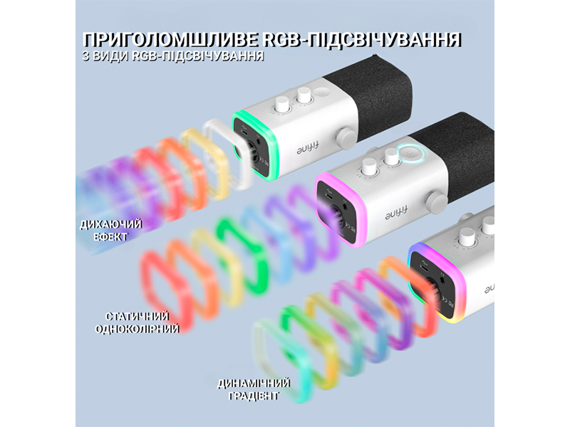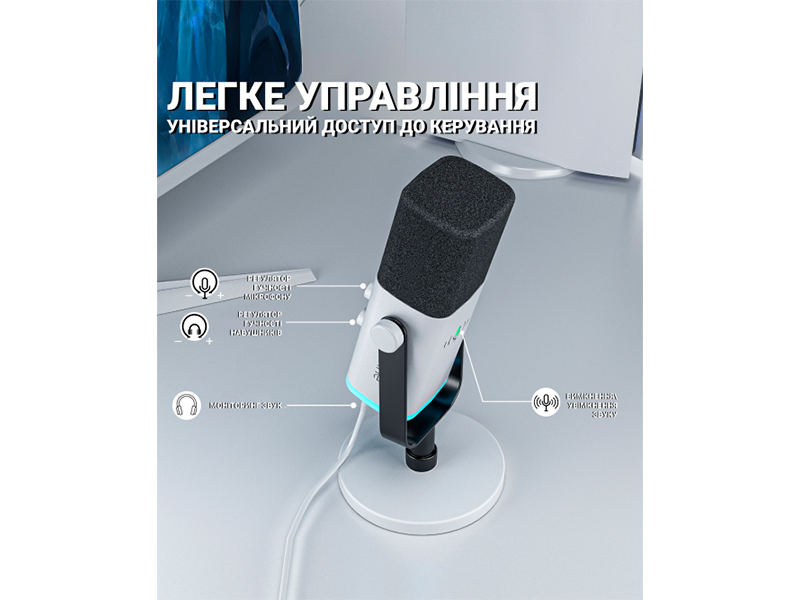 Кнопка гучності навушників дозволяє легко регулювати рівень звуку під час моніторингу запису в реальному часі. Копка зміни режимів RGB підсвічування забезпечує його легке регулювання відповідно до вашого настрою.