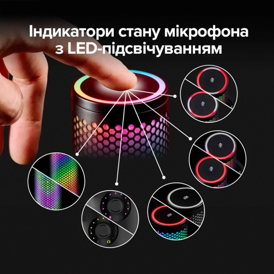 QuadCast 2 S оснащений світлодіодним вимірювачем VU та серією індикаторів, які інформують користувача про режим управління, статус відключення звуку, діаграму спрямованості та гучності.