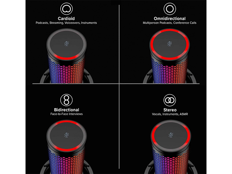 QuadCast 2 пропонує вам чотири полярні діаграми на вибір: кардіоїдну, всеспрямовану, двонаправлену та стерео. Отже, всі ваші потреби в записі задоволені.