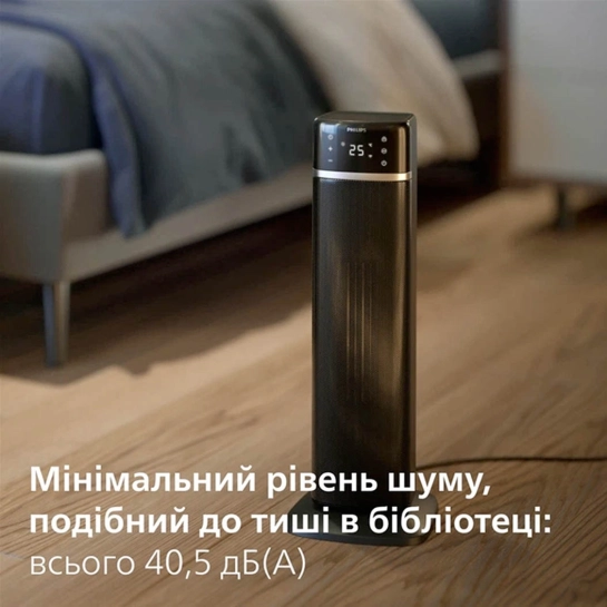 Пристрій забезпечує рівномірний розподіл тепла — завдяки функції осциляції з охопленням ~60°, тепле повітря поширюється по всій кімнаті, без «холодних зон». Навіть при роботі рівень шуму залишається відносно низьким — близько 40.5 дБ(A) (мінімум), що робить модель комфортною для спальні, робочого кабінету чи вітальні.