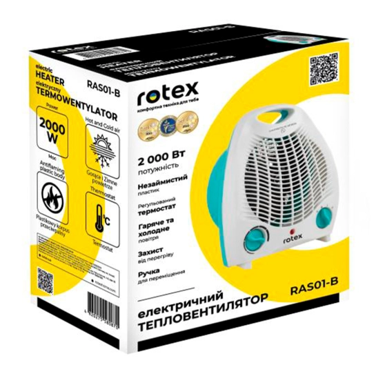 Обігрівач Rotex RAS01-H має потужність 1000/2000 Вт, що дозволяє цьому компактному обігрівачу швидко нагріти повітря в приміщенні площею до 22 кв.м. Тепловентилятор може працювати в режимах - холодне/тепле/гаряче повітря, керування якими виконується за допомогою регульованого термостата. Завдяки наявності такої функції в роботі вентилятора, як включення без нагріву, цю модель можна ефективно використовувати будь-якої пори року. Rotex дуже маневрений і простий в експлуатації