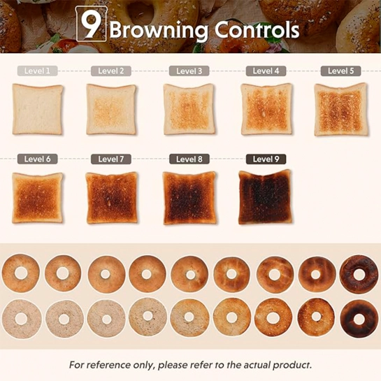 7 рівнів піджарювання та 5 основних функцій із зручними світлодіодними індикаторами. Тостер ідеально підходить не тільки для підсмажування хліба, бейгл, вафель чи випічки, але й для розігріву та розморожування продуктів. Створений для задоволення всіх ваших повсякденних потреб при приготуванні тостів.